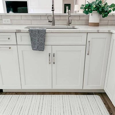 - Gray-and-white runner with the look of a designer rug and feel of a play mat