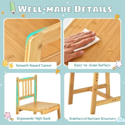 Equipped with a spacious desktop and multilayer bookshelf, this writing desk offers large space to store and organize children’s school supplies or other items. And it is a perfect gift for children, which provides a perfect place for them to read, write, learn, draw, create and more. To adapt to children of different heights, the tabletop and seat can be adjusted to 5 different positions. The height-adjustable design can help children form a right sitting posture and protect their sight as they grow up. And the ergonomic chair back can perfectly fit the child’s spine and provide good protection. What’s more, made of 100% natural bamboo and with smooth round corners, this activity table & chair set is stable, durable and safe for kids to use.