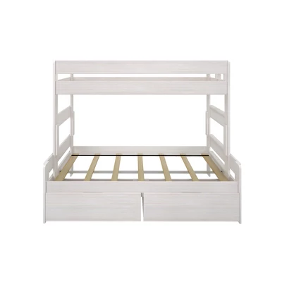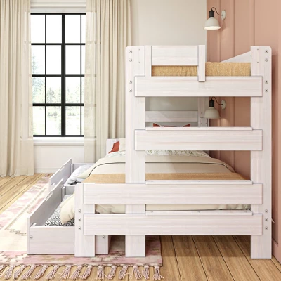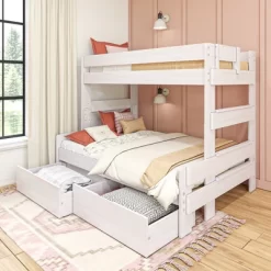Bring the fun of the farm in with the Modern Farmhouse Twin Over Full Bunk Bed with Storage Drawers from Max & Lily. With a fabulous barnwood finish and enhanced safety, this bed offers the perfect combination of fun and functional that kids and parents love. The durable, non-toxic, low-VOC finish makes this bed a safe choice for any kids room. Sleep and storytimes feel secure thanks to a 400 lb resting weight capacity for each sleeping surface. Added storage drawers makes organizing simple. Solid New Zealand pine wood construction, solid plywood slats and metal support bar provide strong, durable support. Works with standard twin and full-size mattresses and does not require box springs or bunkie boards. Super safe design meets or exceeds Federal safety standards for kids furniture. Ships in one box with instructions and hardware included. 2+ adults make assembly quick and easy. When it’s time for play, this beds’ space saving design frees up plenty of room for kids to be kids. The Modern Farmhouse Twin Over Full Bunk Bed with Storage Drawers from Max & Lily offers exceptional quality and affordability that kids and their parents will enjoy for years to come. Max & Lily is a member of the Maxwood family of brands – the kids furniture experts bringing a tradition of superior quality, safety and fun!
