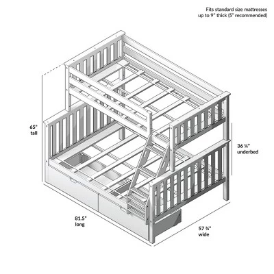 Plenty of room for sleep and play? Now that’s a win-win! The Max & Lily Twin Over Full Bunk Bed with Under Bed Storage Drawers is the perfect combination of functional and fun that both kids and parents love. Top bunk features tall 14” guardrails, so the bed safely fits standard mattress sizes. Angled ladder with rounded edges offers comfortable, easy climbing. Added bonus – ladder is both reversible and removable, so it is flexible to work with any space. Included storage drawers organize your clothes, toys and extra bedding. Solid, knot-free New Zealand pine wood adds strength and stability. All Max & Lily products use a durable, low VOC finish. The slatted head and footboards and flush, color-matched hardware give this bunk bed a clean, modern look. Instructions, upper/lower slat rolls, and required hardware are included. With solid plywood slats and a metal support bar, each sleeping surface can support 400 pounds of resting weight. This bed meets or exceeds Federal safety standards for kids furniture. When it’s time for play, this bed’s space saving design frees up plenty of floor space. The Twin Over Full Bunk Bed with Under Bed Storage Drawers from Max & Lily offers exceptional quality and affordability that kids and their parents will enjoy for years to come. Max & Lily is a member of the Maxwood family of brands – the kids furniture experts bringing a tradition of superior quality, safety and fun!