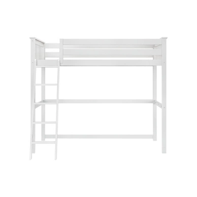 Get a chic sleeping space without sacrificing floor space with the Twin High Loft Bed from Max & Lily. Clean modern lines and neutral finishes give this bed a classic look that works with any decor or style. Tall, 14-inch guard rails provide ample sleep security. Angled ladder with anti-slip rounded steps provides easy and comfortable access to the loft. The ladder can be installed on the left or right side, so the bed can perfectly fit your space. The durable, low VOC finish is easy to maintain. Flush, color-matching hardware maintains the clean look. Solid New Zealand pine wood construction plus strong plywood slats and metal support bar provide a high 400-pound weight capacity. Accommodates standard twin-size mattresses and does not require a box spring or bunkie board. An 8-inch maximum mattress thickness provides the best fit. This bed meets or exceeds federal safety standards for children’s furniture. Instructions, slat roll, tools, and required hardware are included. 2+ adults make assembly easier. Bed ships in one box and is heavy due to solid wood construction. Mattress and bedding not included. With quality, style, and affordability, you will enjoy this twin high loft bed for years to come.
