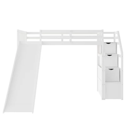 This loft bed is a great option. The upper bed can be used to have a good dream, and the lower space can be used as you like. The design of the slide adds fun to you, and they will love this little space that belongs to them even more. The storage design on the ladder relieves the troubles of mothers, and they have more places to put home items. Don’t worry about the safety of this bed, high guard rail design, ladder with handrail, slide with shock absorption function.