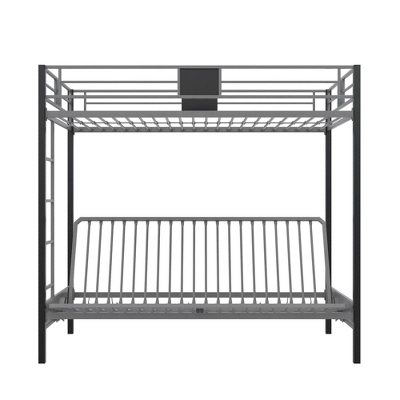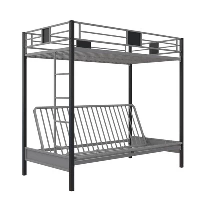 The Room & Joy Maxence Twin over Futon Metal Bunk Bed is modern, hip and trendy. Whether used in a big kid room, a guest bedroom or in your studio apartment, this chic frame brings in full on versatility with space for a twin size mattress at the top and a futon at the bottom that serves a couch by day and as a full size bed by night. The Maxence is designed with clean and sleek lines to become a focal point of the room. It also features full-length guardrails, a childproof mechanism and a secured ladder to ensure top safety. This bunk bed is the ideal space-saving option for a room of any size. Mattresses sold separately.