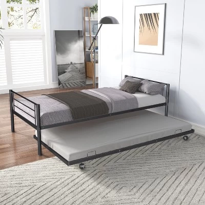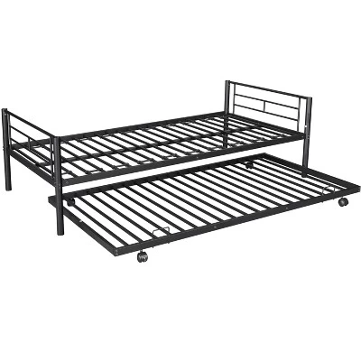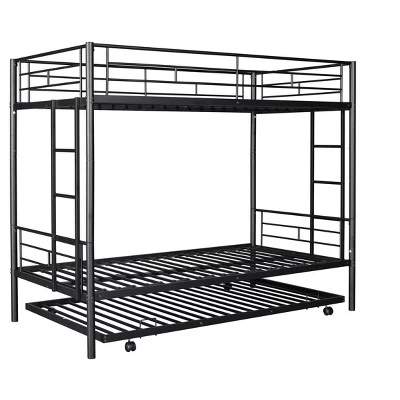 Introducing the ultimate solution for space-saving comfort – our sturdy metal bunk bed. Engineered for enhanced durability and safety, it features steadfast metal slats that not only firmly support mattresses, but also extend their lifespan. Equipped with full-length guard rails around the top bunk, it ensures your child’s safety and a sound night’s sleep. Our twin-over-twin bunk bed with trundle takes versatility to the next level, offering an ingenious trundle beneath the lower bunk for additional sleeping space. Its ingenious design allows you to seamlessly transform it from a bunk bed to two separate twin beds, adapting to your evolving needs. As your children grow, you have the flexibility to divide and place them in different rooms, all while the contemporary design effortlessly blends with your bedroom décor. Experience the perfect fusion of functionality and style today.