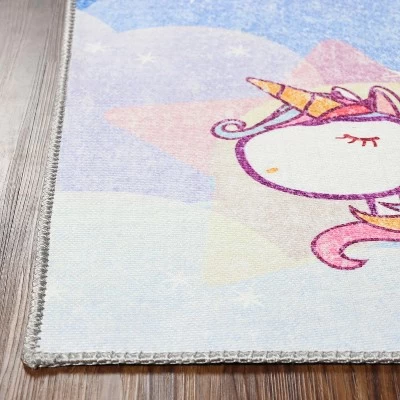 Add dynamic color to your playroom with the Unicorn Rainbow Colorful Kids Playroom Nursery Washable Indoor Area Rug by Blue Nile Mills. The enchanting style of this area rug will make any room in your home cheerful. The polyester material is incredibly durable while being a soft and comfortable foundation for your floors. This beautiful area rug is available in a variety of popular rectangular sizes to perfectly fit your kid’s room, playroom, nursery, daycare, or school room. For your convenience, this vibrant and colorful rug is machine washable for easy clean up from pets or children. Room Types: Entryway, Kids Room, Baby Room, Mudroom, Any Room, Basement, Bedroom, Dining Room, Foyer, Hallway, Home Office/Study, Kitchen, Living Room, Lounge